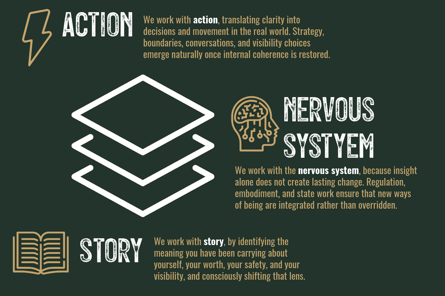 We work with story, by identifying the meaning you have been carrying about yourself, your worth, your safety, and your visibility, and consciously shifting that lens.