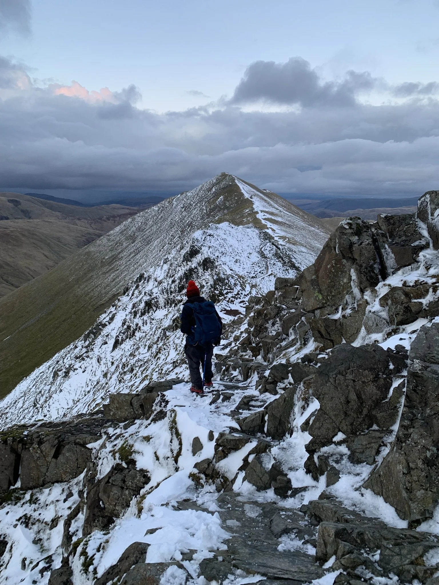 I was terrified. Striding Edge is a rocky ridge, pretty darn high up, and is intimidating in normal conditions. In slippy snow, it’s no joke.